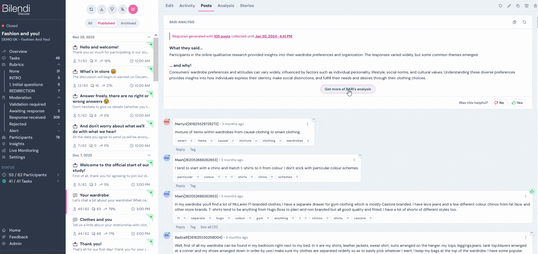 Die Umfrage wird von BARI automatisch moderiert - immer dann, wenn die TeilnehmerInnen online sind. Zusammen mit der professionellen Moderation, die nicht von der eines Menschen zu unterscheiden ist, trägt dies zu noch tieferen Insights bei. BARI kann ebenfalls die Antworten der TeilnehmerInnen übersetzen, Audios und Videos transkribieren oder Sentiment-Analysen verschiedener Antworttypen erstellen.